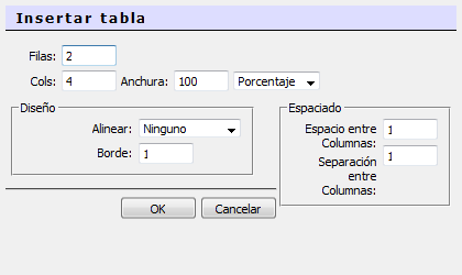 Insertar tabla ( ): Este botón nos permite insertar una tabla HTML en el texto. Aparecerá un pequeño cuadro de dialogo donde podrá especificar las características de la tabla: número de filas y columnas y el ancho total de la misma. Tengamos en cuenta que la forma de especificar el aspecto de una tabla HTML es diferente de como se estructuran las tablas utilizando un editor de texto de oficina. Consulte un manual de HTML/CSS si necesita posicionar y estructurar con suma precisión las tablas.