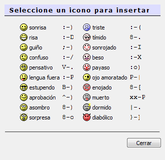 Insertar emoticones ( ): Permite insertar el símbolo grafico de un emoticono. Estos elementos son muy útiles para indicar el tono de una expresión y permiten expresar una gran variedad de matices para un mismo texto. Es muy recomendable usarlos con liberalidad en los mensajes de foros y correo electrónico. Desde luego, no tienen la misma aplicabilidad en un texto formal. Puede escribir las formas textuales de los emoticones y el editor las convertirá automáticamente en un pequeño grafico cuando se visualice el texto en TecnoLearning. Por ejemplo si escribe “:-)” aparecerá luego el icono. (En el editor seguirá viendo la forma textual).