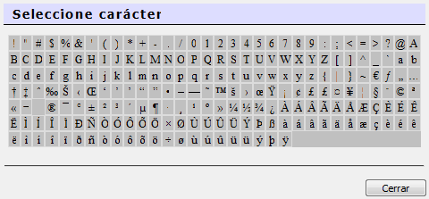 Insertar caracteres especiales ( ): Este botón hace aparecer en una paleta el juego de caracteres que esté usando en ese momento en su navegador. La paleta nos permite seleccionar e insertar un carácter cualquiera.