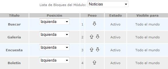 En la imagen anterior, los Bloques Buscar, Galería, Encuesta y Boletín aparecen cuando se visualiza el Módulo de Noticias en el Portal, dichos bloques se muestran en el lado izquierdo, están activos y son visibles para todo el mundo. Como se puede observar, en el listado es posible establecer la posición de los módulos / bloques asociados al módulo seleccionado (Centro Arriba, Centro Abajo, Izquierda, Derecha) y, además, indicar la ubicación numeral (Peso) dentro de la posición seleccionada con la ayuda de las flechas.