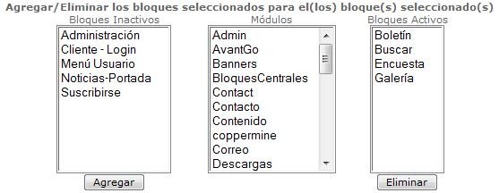 Más abajo del listado anterior, se muestran unos cuadros que permiten realizar el movimiento de los bloques por módulos. Si se desea agregar algún otro bloque a un módulo, debe seleccionar el nombre de dicho bloque en la lista de Bloques Inactivos e incorporarlo haciendo click en “Agregar”. Si por el contrario, lo que se desea es desincorporar un Bloque a un módulo, debe seleccionar el nombre de dicho bloque en la lista de Bloques Activos y hacer click en Eliminar, previa selección del módulo disponible para tal fin en la lista central (Módulos).