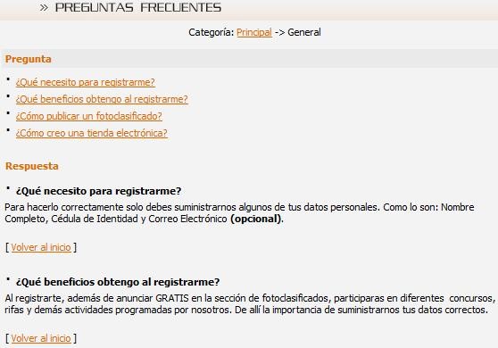 Es un archivo de preguntas / respuestas dividido en categorías que puede ser consultado por el usuario como una primera solución a sus inquietudes o para resolver sus dudas. Se pueden dividir las preguntas y respuestas por categorías para facilitar su consulta. Ejemplo general: