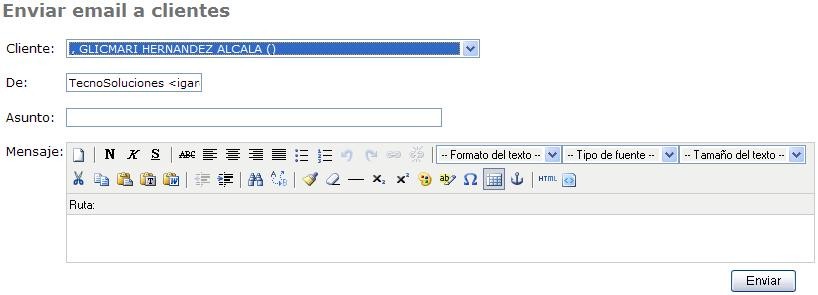 El administrador de la tienda puede enviar directamente un email con un sencillo formulario a los usuarios registrados. Puede ser a un cliente en específico o a todos. Para el contenido cuenta con un amigable editor en línea.