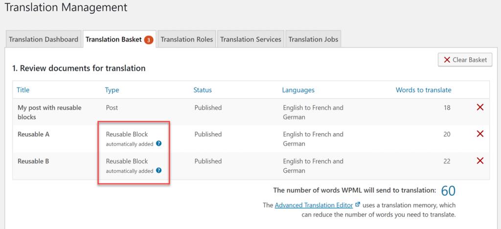 Todos los bloques reutilizables se agregarán a la cesta de traducción. Si el bloque ya ha sido traducido o está esperando por un traductor, no se genera el trabajo de traducción.
