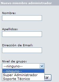 Lista a los administradores que están configurados en el sistema y sus datos principales como: nombre, email, grupo al que pertenece (Nivel), número de login, fecha y hora de creada la cuenta, entre otros. Con posibilidad de editarlos, eliminarlos y/o agregar nuevos administradores. Es importante destacar que al agregar un Administrador (Nuevo Miembro), se debe seleccionar el Nivel de Grupo al cual pertenece, estos grupos indican el nivel de acceso que tendrá permitido dicho administrador dentro del Sistema Administrativo del TecnoCommerce (Por ejemplo: un SuperAdministrador tiene acceso a todos los módulos).