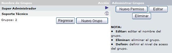 Por otro lado, al hacer clic en el botón “Grupos”, se muestra el listado de los grupos existentes y por cada uno es posible editar el nombre del mismo, borrarlo y/o definir / cambiar el nivel de acceso (Nuevo Permiso).