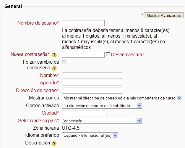 Un administrador puede agregar usuarios al curso, siguiendo la configuración del bloque de administración. El añadir una página de usuario nueva le permite crear manualmente una nueva cuenta de usuario. Si crea una cuenta de prueba, puede utilizar una dirección de correo electrónico. El campo obligatorio se debe introducir antes de que el usuario sea aceptado por TecnoLearning. Los campos requeridos en el formulario de TecnoLearning son: Nombre de usuario, contraseña nueva, apellidos, dirección de correo electrónico, ciudad / pueblo, seleccione un país.