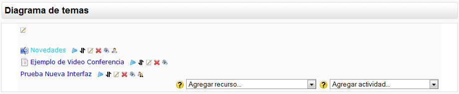 Basta seleccionar un tipo de recurso o de actividad y se añadirá un elemento de esa clase al final de la lista de elementos del tema en cuestión.