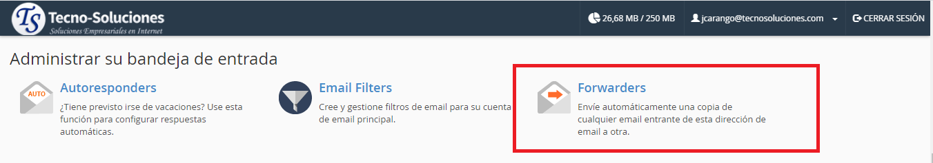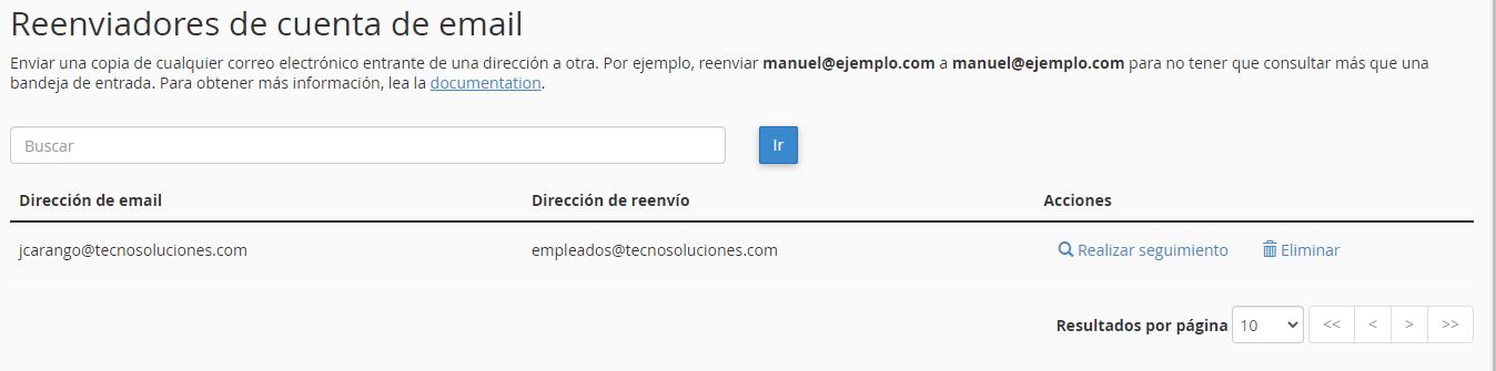 Nota: Para administrar reenviadores para cuentas de correo electrónico que usan la función BoxTrapper , use la interfaz BoxTrapper . Para obtener más información, lea nuestra documentación sobre Lucha contra el spam en Webmail .