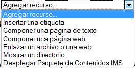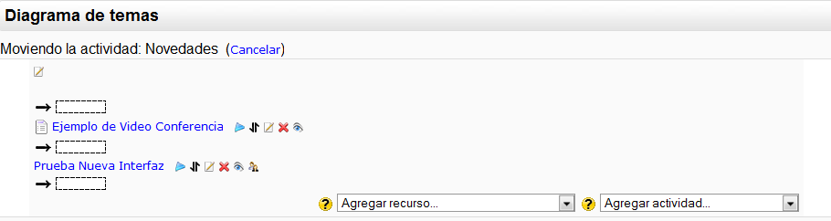 Cuando se pulsa en este icono se modifica la ventana y aparecen una serie de recuadros indicadores de los lugares posibles en el que podemos ponerlo a lo largo de la lista de elementos del curso, en todos los bloques temáticos (Fig.41).