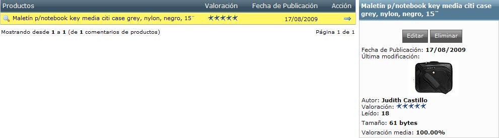 Permite corregir o suprimir los comentarios. La interfaz es igual que el resto del Sistema de Administración de la Tienda, inicialmente aparece un listado de los productos que han tenido comentarios con la evaluación, la fecha del comentario, nombre de la persona y la posibilidad de editar / eliminar el comentario. A su vez, al hacer clic en algunos de los nombres listados, aparece el detalle de lo comentado, como, por ejemplo: