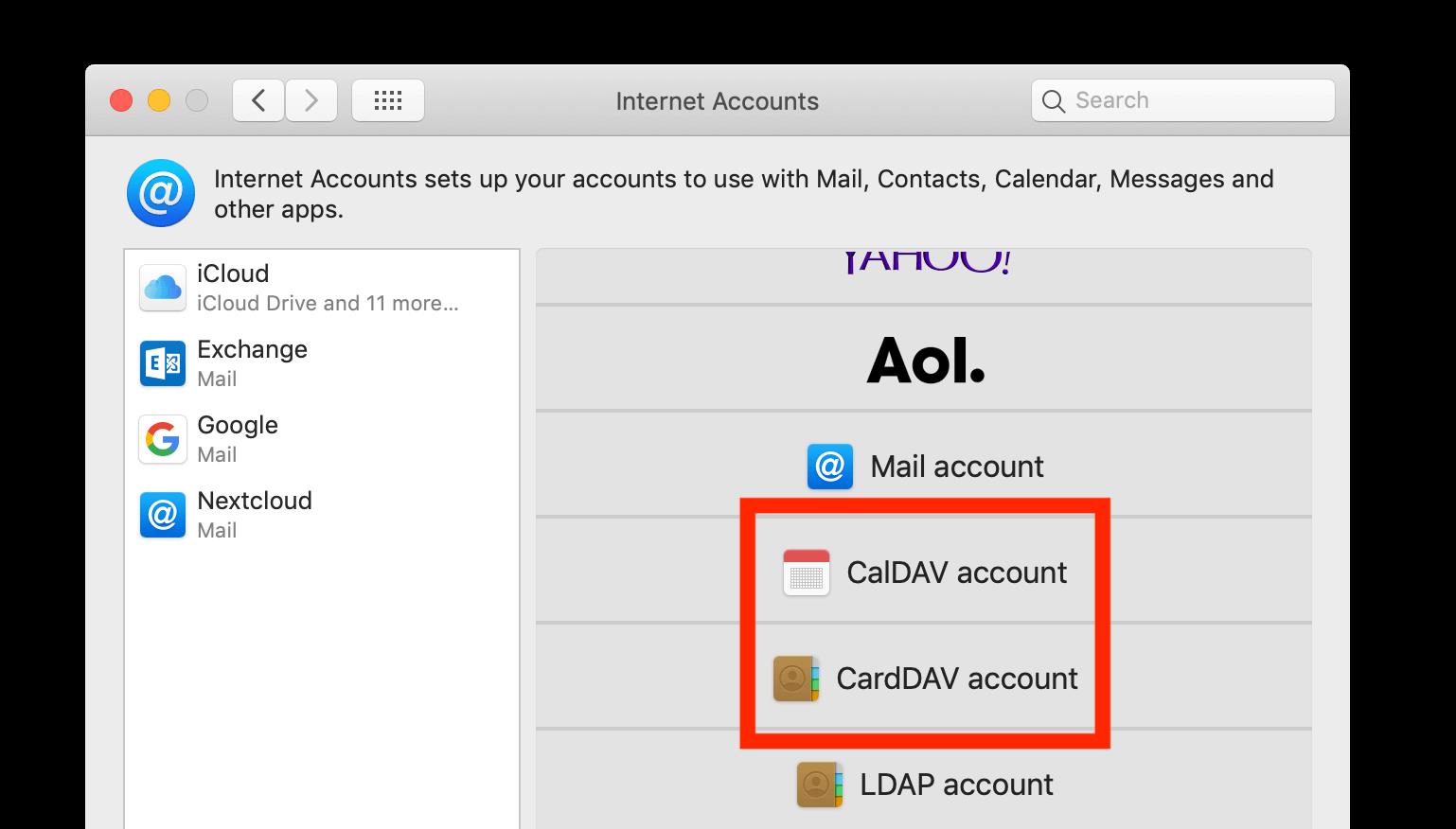 - Haga clic en Agregar otra cuenta … y haga clic en Cuenta CalDAV para calendario o Cuenta CardDAV para contactos.