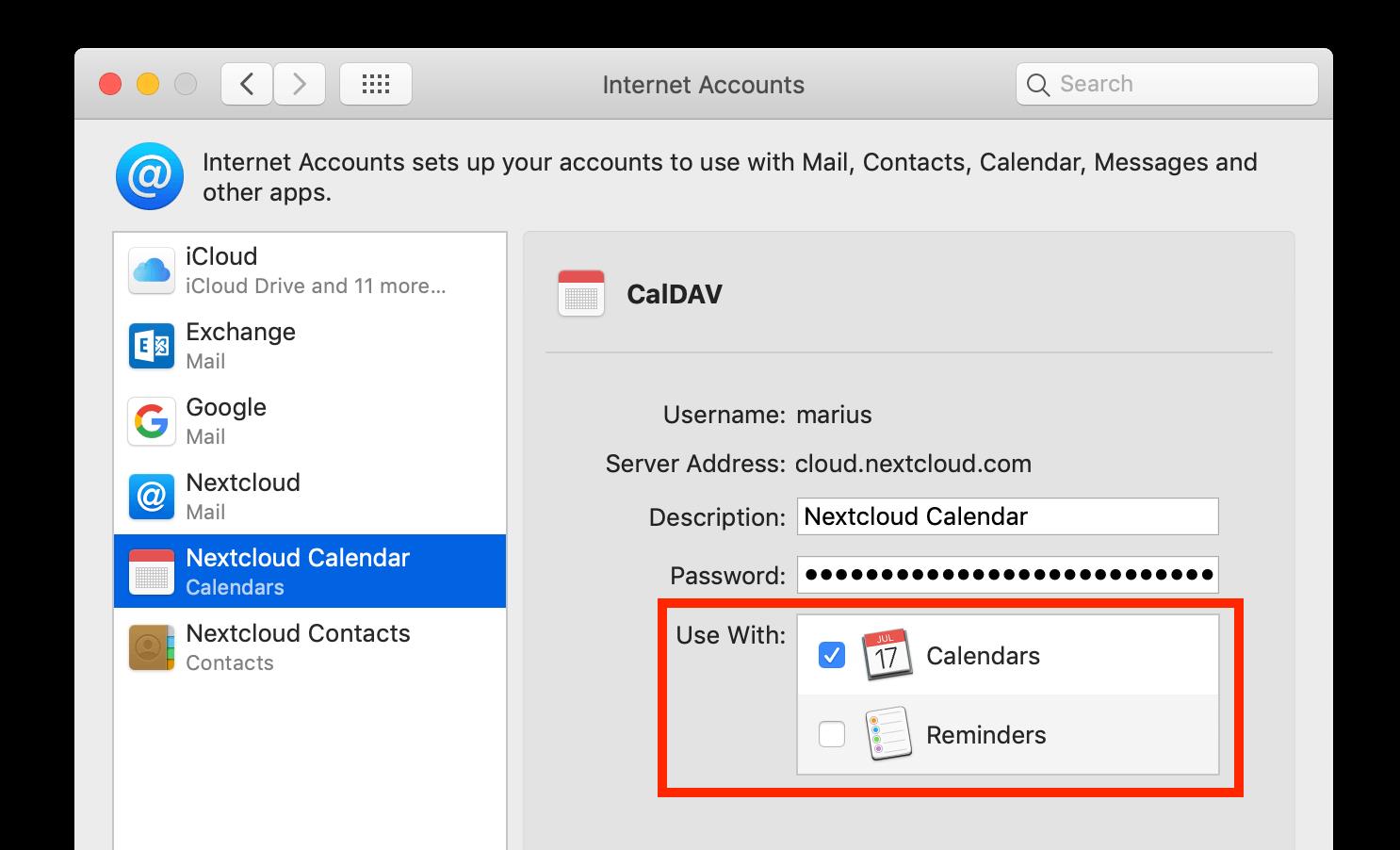 Para CalDAV (Calendario): ahora puede seleccionar, con qué aplicaciones desea utilizar este recurso. En la mayoría de los casos, esta será la aplicación “Calendario”, a veces es posible que también desee utilizarla para sus tareas y recordatorios.