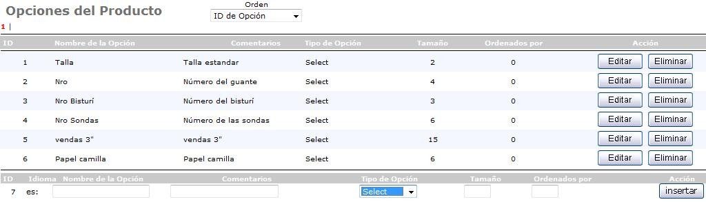 Permite crear las opciones que necesitará que estén disponible para sus productos, puede ser: accesorios, talla, color, modelo, versión, etc. Crear las opciones es muy fácil, coloque el nombre de la opción en el rectángulo (campo) de texto que corresponda (“en”: en inglés o “es”: en español, en su caso particular solo debe escribir en “es”), escriba algún comentario que le sirva de referencia sobre la opción que está creando, seleccione el tipo de opción, coloque el número en que debe ser ordenado el atributo (si lo deja vacío o a todos le coloca 0: orden alfabético, 1: primero en la lista, 2: segundo…, etc.) y haga clic en el botón de “insertar”. Esto crea una lista de opciones principales, pero no asigna los valores a esas opciones. Eso se hace en el paso siguiente. Por otro lado, las opciones existentes (listadas en el cuadro) pueden ser eliminadas o editadas. A continuación, un ejemplo general referencial: