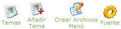 Inicialmente aparece un submenú con una serie de opciones, comenzando por la configuración general del menú (“Temas”), donde se establece la ID del mismo en el Portal, el nombre del Tema y las funciones estándar de Editar / Borrar. (Nota: Se recomienda consultar antes al Departamento Técnico de Tecno-Soluciones para hacer modificaciones en la secciones: Temas, Añadir Tema, Crear Archivos Menú, Blocks y/o Fuente, ya que requiere de ciertas especificaciones previas).