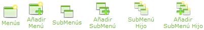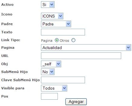 Añadir Submenú: Son los nombres que abren debajo de los títulos principales del menú. Para agregar un Submenú se debe ingresar el nombre (texto), el URL asociado, si va a estar activo o no, el icono (imagen), el Padre al que debe pertenecer (si va a aparecer dentro de contacto o servicios o productos…) y si va a tener SubMenú Hijo (de tenerlo, se debe escribir la clave o nombre asociado). Vale decir que un SubMenú Hijo es el código de referencia para ubicar un nombre que se abriría debajo del submenú, es decir, representaría una división más al menú. Generalmente se coloca al SubMenú Hijo el mismo nombre del título del submenú o similar.