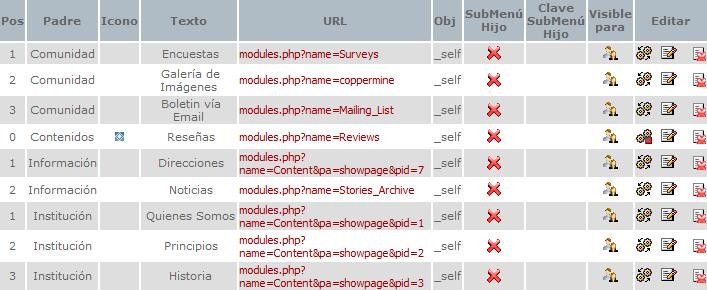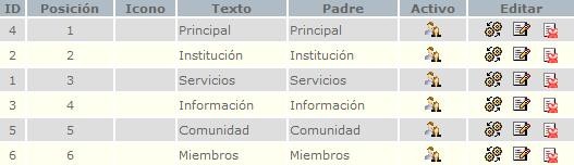 Menús: Muestra el listado de los nombres principales que aparecen en el menú, junto con la posición, icono (imagen asociada), texto que aparecerá publicado (Título Principal), Parent (Padre) al cual pertenece (nombre referencia para los SubMenús), para quiénes estará visible, si está activo o no y la posibilidad de editarlos o eliminarlos. La Posición es de 1, 2, 3,… en adelante comenzando por la izquierda.