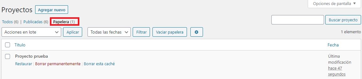 Para ver la Papelera le damos clic al botón que lleva su nombre en las opciones que aparecen al lado del buscador. Una vez que le damos clic mostrara todos los proyectos que se encuentran dentro de la papelera.