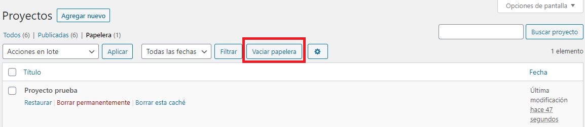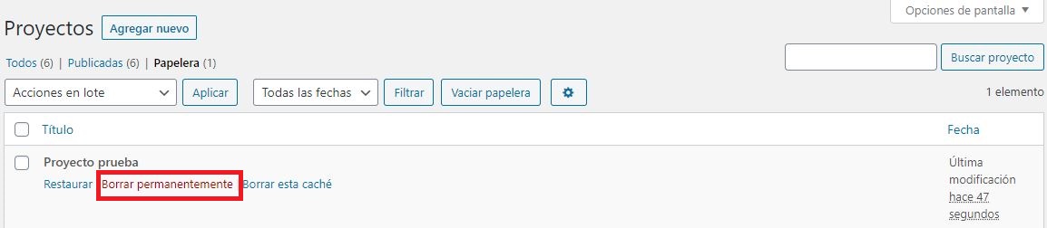 Como podemos observar también podemos eliminar uno a uno cada proyecto dentro de la papelera al darle clic al botón Borrar permanentemente.
