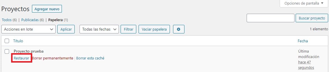 También podemos restaurar los proyectos posicionando el cursor sobre los proyectos eliminados para observar las opciones y darle clic donde dice Restaurar.