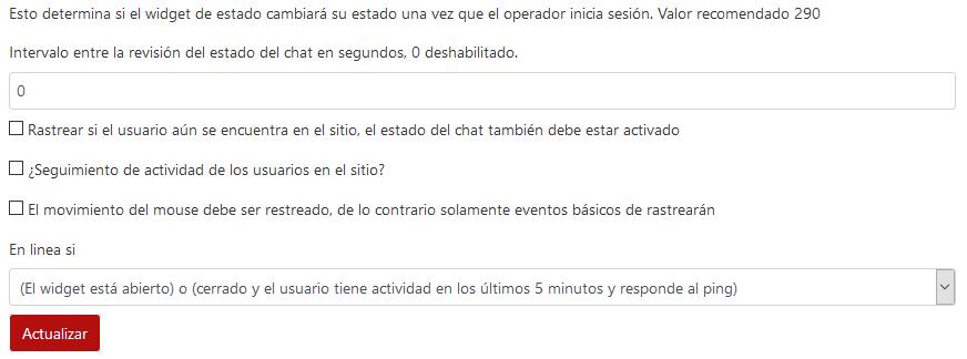 Si se escribe “120” segundos, significa: verificar si el usuario todavía está en el sitio y verificar el estado de los operadores cada 120 segundos. Si desmarca la primera casilla de verificación, solo se ejecutará la verificación con respecto a si los operadores aún están disponibles cada dos minutos.