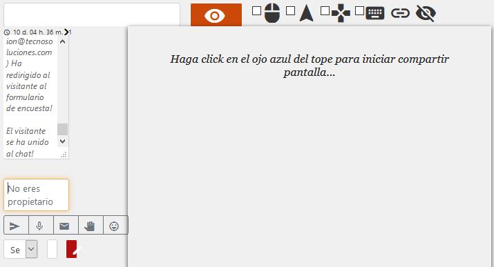 - Ojo rojo: si se mueve el mouse, se indicará en qué estado se encuentra la ventana para compartir la pantalla. Si no ve el mensaje, haga clic para compartir una pantalla, eso significa que se está pendiente de acciones del Visitante. Tan pronto se haga clic en el ojo azul, se le solicitará al Visitante que otorgue permiso para ver su pantalla.