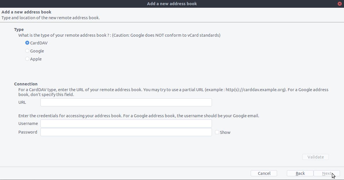 - Seleccione CardDAV, complete la dirección de su servidor TecnoCloud, su nombre de usuario y contraseña