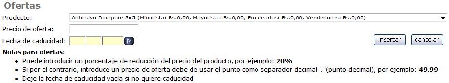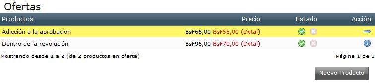Esta sección es donde usted agrega los productos en “Ofertas” y fija sus características, tachando el precio original y destacando el nuevo precio en color rojo. Si usted hace clic en el icono verde, la Oferta está activa, si lo hace en el icono rojo, la Oferta está inactiva. También puede editar y/o eliminar la oferta. Ejemplo para su referencia: