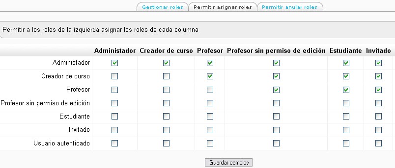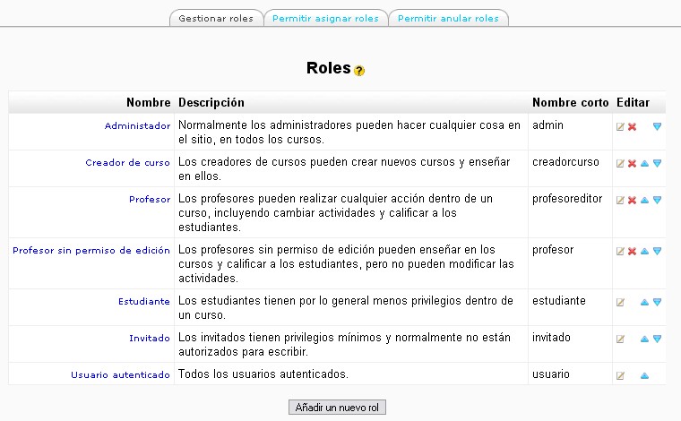 En ésta ventana se encuentran tres pestañas, una gestionar roles, la segunda Permitir asignar roles y la tercera, permitir anular roles. En ella se encuentran: el nombre del rol, la descripción del rol, el nombre corto del rol, y el campo de edición con los iconos correspondientes.