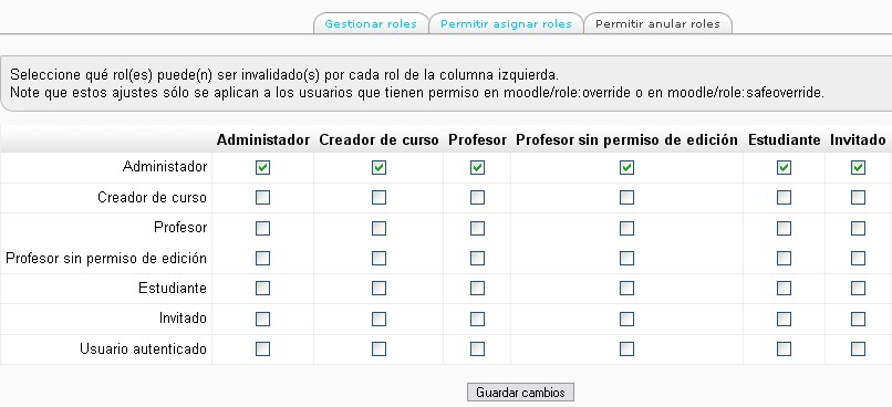 La pestaña de “Anular roles” permite a un usuario con los privilegios de rol necesarios asignar o quitar privilegios para otros roles en el contexto de un curso.