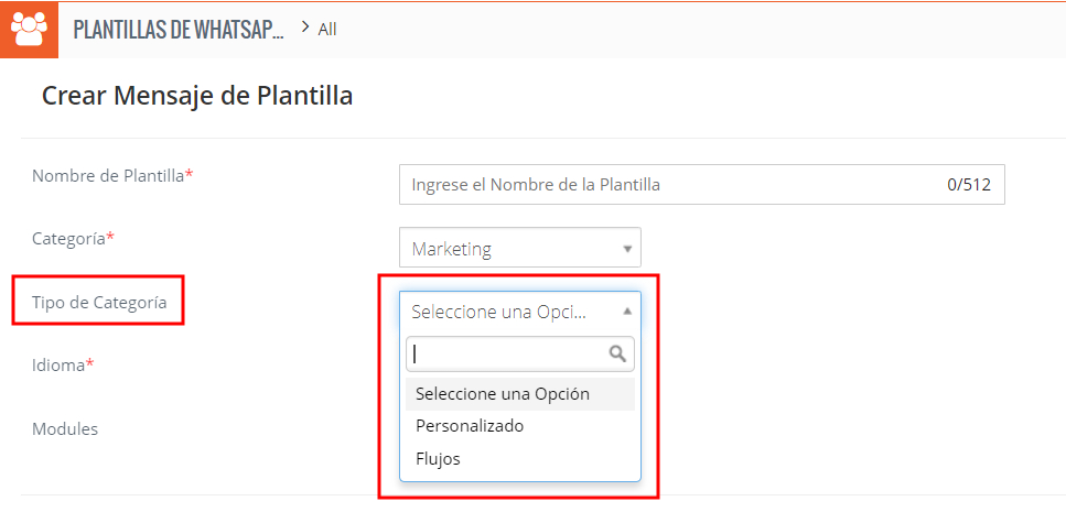 - Seleccionar módulo: seleccione el módulo para el que desea crear esta plantilla de WhatsApp Business.