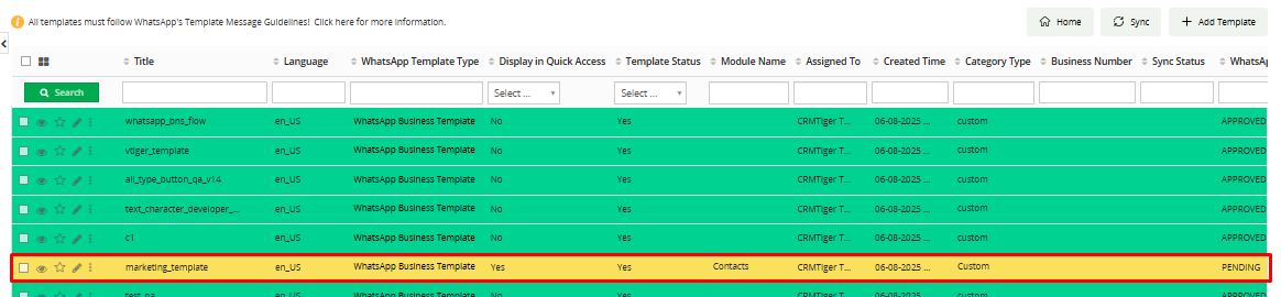 Al hacer clic en “Guardar y enviar”, se enviará una solicitud a meta para la aprobación de la plantilla. Hasta que se apruebe, el estado se mostrará como “Pendiente (Pending)” y en color amarillo.