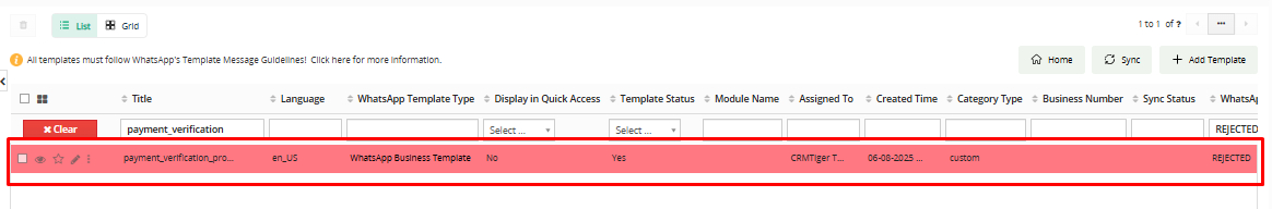 Puedes ver la plantilla si ha sido rechazada por Meta, como se muestra en la captura de pantalla a continuación, donde indica el estado “Rechazado (Rejected)” y en color rojo.