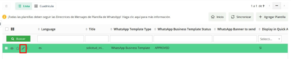 También puede editar la plantilla desde la vista de lista haciendo clic en el icono de “Editar” (Lápiz) como se muestra a continuación.