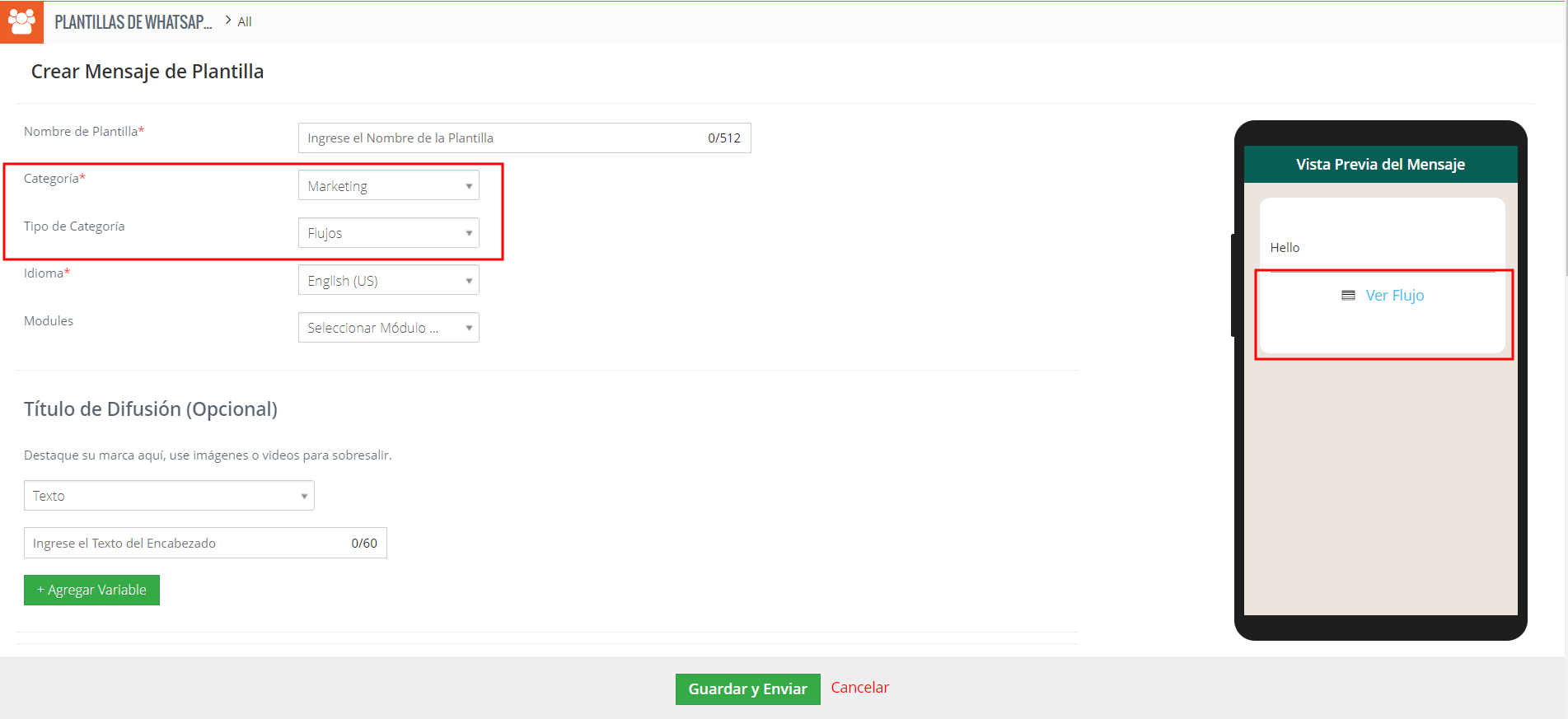 - Módulos: especifique los módulos relevantes asociados con la plantilla de flujo para categorizar o simplificar su funcionalidad.