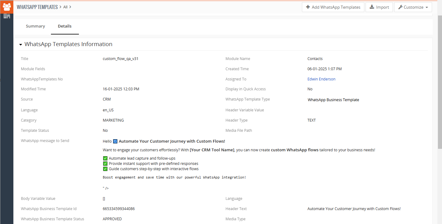 Una vez que el usuario ingresa los detalles en el flujo, los datos se guardan en el CRM y se crea automáticamente un nuevo registro en el módulo designado de la plantilla.