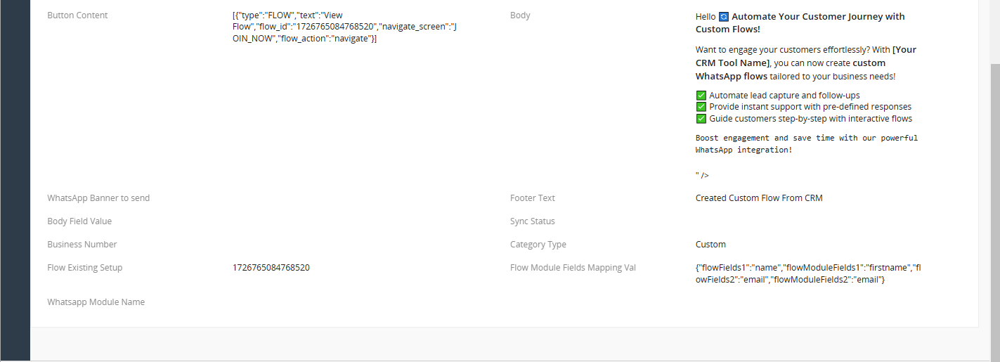 Esta vista muestra toda la información introducida por el usuario durante la creación del flujo. Incluye detalles clave como el cuerpo del mensaje, los campos del destinatario y cualquier parámetro o personalización específica añadida. Este resumen ofrece una visión general completa, garantizando que la configuración del flujo se ajuste a la deseada.