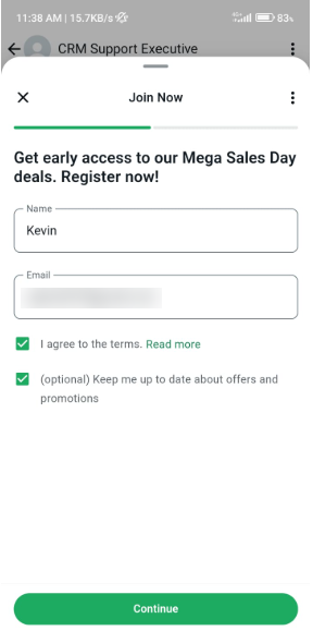 En esta pantalla, el usuario deberá completar sus datos, incluyendo su nombre y correo electrónico. Una vez ingresada la información, puede continuar haciendo clic en el botón “Continuar (Continue)” para pasar al siguiente paso. Esto garantiza que el sistema recopile la información esencial del usuario para futuras interacciones o comunicaciones.