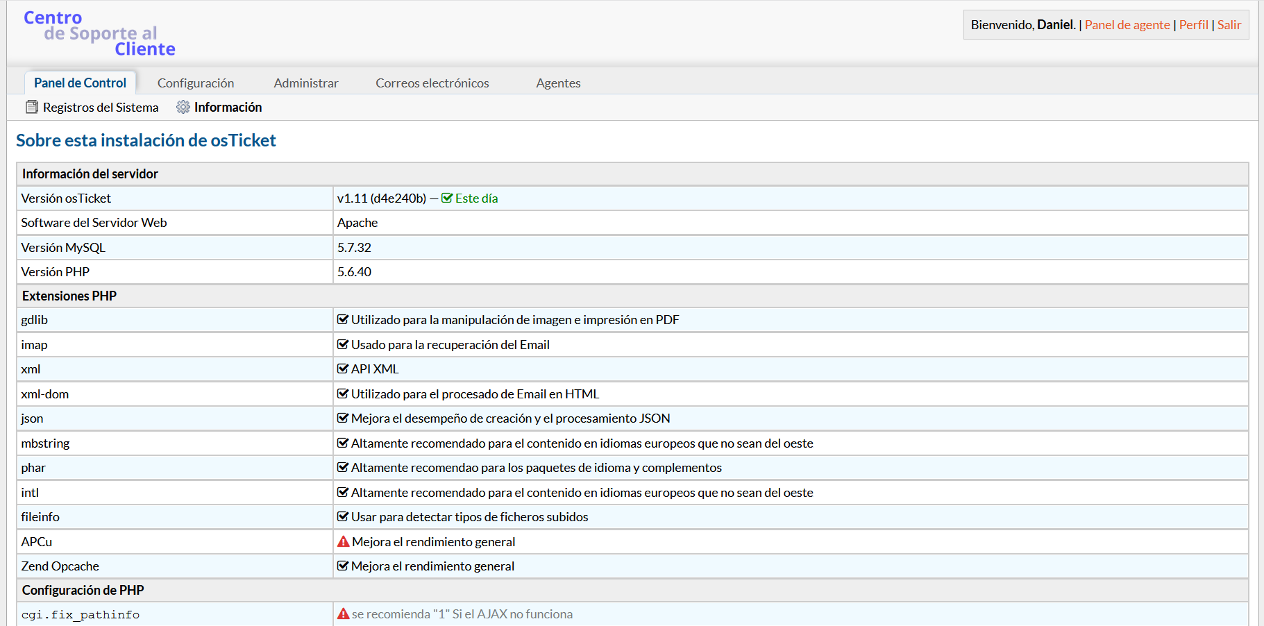 Esta sección del Panel de administración describe el sistema en el que está instalado TecnoSupport. Esta sección muestra la información del servidor del sistema, las extensiones PHP, la configuración PHP (que tiene que ver con el archivo php.ini), la información y el uso de la base de datos y los paquetes de idioma instalados asociados con TecnoSupport.