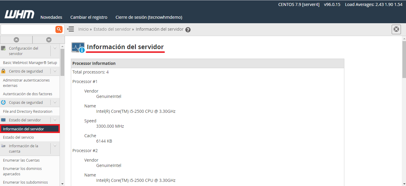 La interfaz muestra la información del servidor en las siguientes seis secciones: