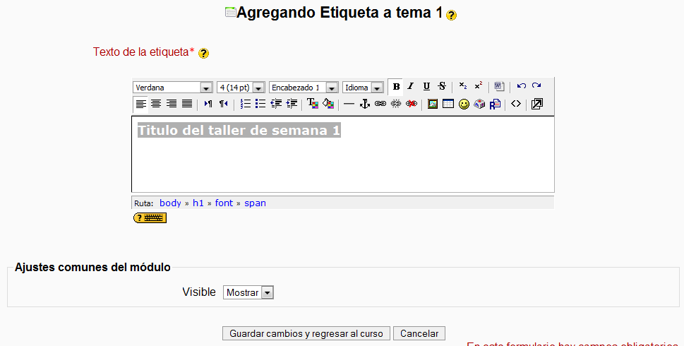 Al editar una etiqueta simplemente se despliega el editor de texto HTML que ya hemos visto, para permitir la inserción del texto. Esto significa que el texto de una etiqueta puede ser tan largo y complejo como necesitemos (hasta el límite de 2MB por archivo del Campus virtual).