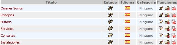 El sistema, desde el menú de administración, muestra en un principio un listado con el Contenido (páginas básicas ya existentes) del Portal, indicando su Estado (Activo o Inactivo), la Categoría a la cual pertenece, el idioma y la posibilidad de editar / desactivar / borrar la información existente.