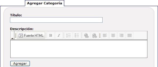Permite agregar categorías nuevas (de requerirse) dentro del módulo content. Para Agregar Categorías se llena un formulario colocando el título y una breve descripción que identifique a dicha categoría. El Portal CRUZROJABARINAS.COM.VE no tiene configurada categorías. También es posible tener páginas no asociadas a ninguna categoría.