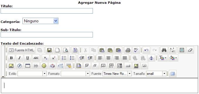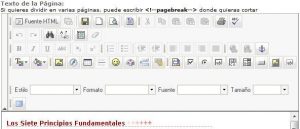 - Texto de la Página: Es el texto central (cuerpo principal de la nueva página) y cuenta con el Editor de Páginas Web HTML para dar formato a su página. Con dicho editor puede incluir imágenes, colores, tablas, enlaces, videos, flash, etc., también, se puede dividir el texto en varias páginas con solo escribir <! –pagebreak — > donde se va a realizar en corte. Por favor practique antes de publicat/activar una nueva página. (es opcional)