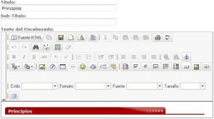 - Texto del Encabezado: Sale separado del texto central, es decir, se muestra en la parte superior del área de la nueva página y sirve, por ejemplo, para colocar un pequeño comentario sobre lo que a continuación se va a leer (No es imprescindible). Típicamente se coloca una imagen tipo cintillo en la cual se identifica el contenido de dicha página. Puede editar una página ya existente para que observar cómo se manejaron estos detalles en la misma.