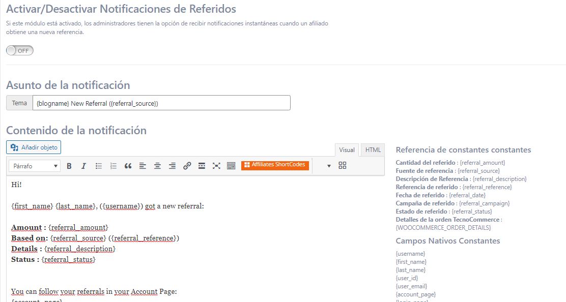 Si este módulo está activado, los administradores tienen la opción de recibir notificaciones instantáneas cuando un afiliado obtiene una nueva referencia.