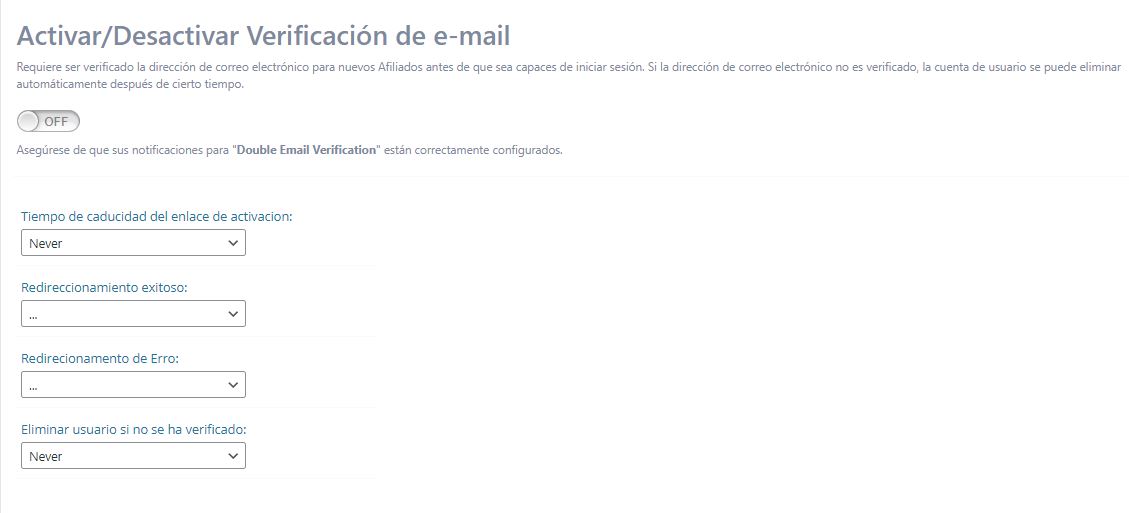 Puede establecer cuándo caducará el enlace de activación, dónde se redirige al afiliado después de verificar con éxito o no y si el usuario se elimina o no si el correo electrónico no se verifica.