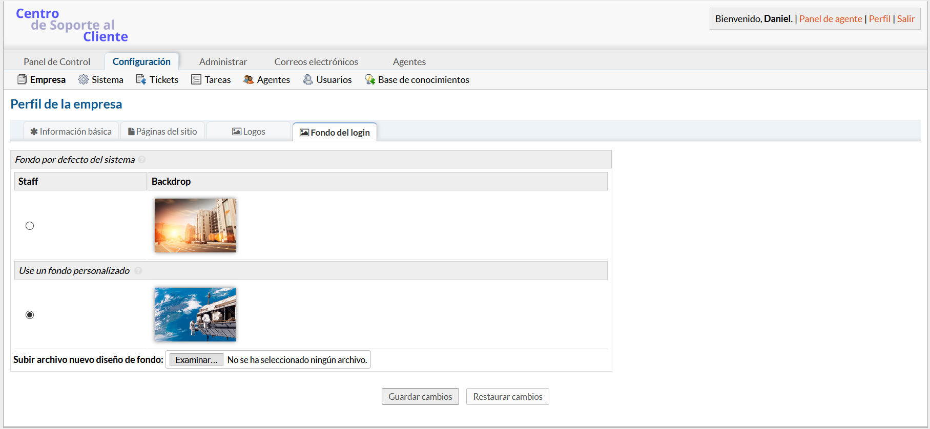 Cargue una imagen para personalizar el Fondo que se mostrará en la página de inicio de sesión del personal. Elija una imagen en los formatos .gif, .jpg o .png. Cambiaremos proporcionalmente el tamaño de la visualización de su imagen. Sin embargo, no cambiaremos el tamaño de los datos de la imagen. Por lo tanto, para acelerar los tiempos de carga, se recomienda que mantenga su imagen relativamente pequeña (menos de un megabyte). Tenga en cuenta también que se aplica la configuración de carga máxima de PHP.