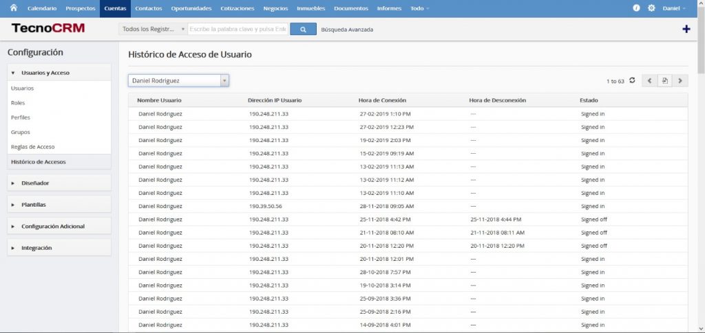 Como administrador del sistema TecnoCRM usted podría querer saber quién ha ingresado al sistema. En este menú usted puede conseguir la historia de las conexiones para cada usuario individual. Abra el menú y seleccione el usuario para el que verá los detalles de las conexiones. Note que la fecha y la hora de la conexión siempre se muestran. Los datos de salida del sistema solamente están disponibles si un usuario utilizó el botón de Salir del sistema.