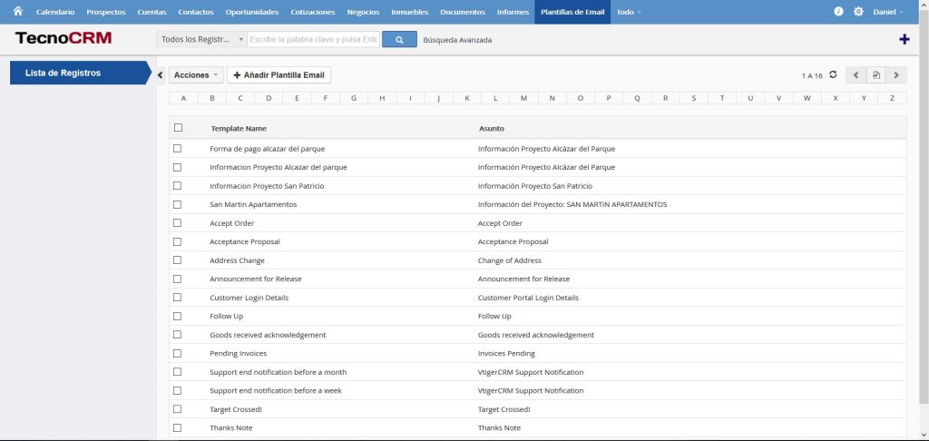 Si usted utiliza el CRM para enviar emails estándar con frecuencia es muy útil tener dichos emails disponibles como plantillas. Para ver la lista de plantilla de emails existentes, haga clic en el menú Plantillas de Email. Usted puede modificar plantillas existentes o crear un número ilimitado de nuevas plantillas. Observe que hay plantillas públicas y privadas. Las plantillas públicas están disponibles para todos los usuarios del CRM. Las plantillas privadas son utilizadas solamente por los usuarios particulares.